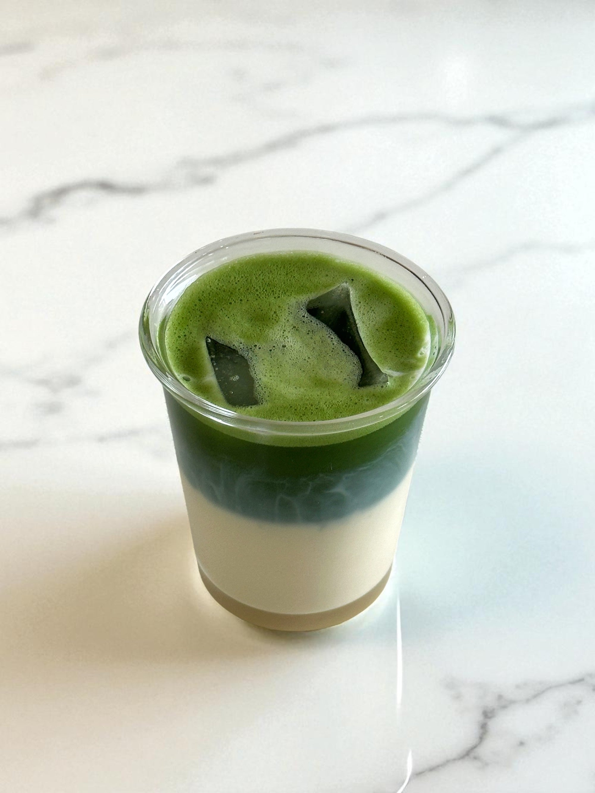 Sift 3g matcha. Add 30ml water at 75 °C, whisk. Pour over 80ml warm milk (or iced with cold milk).