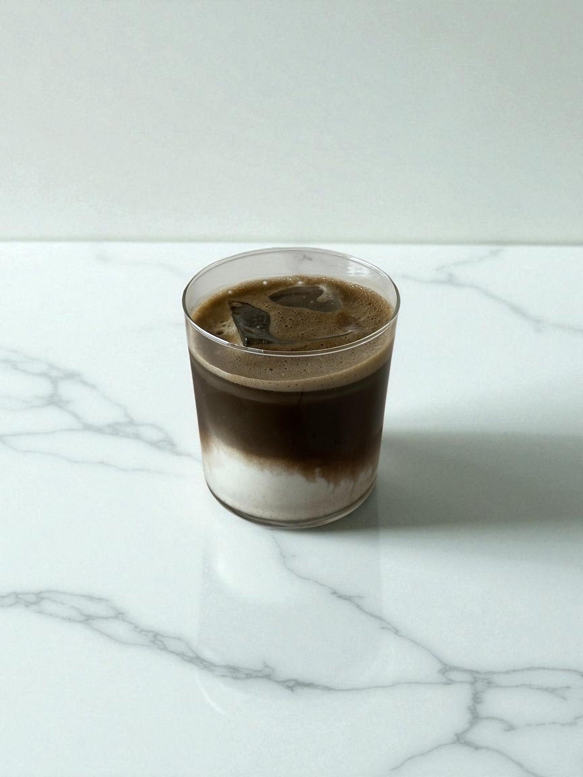 Sift 3g hojicha. Add 30ml water at 75 °C, whisk. Pour over 80ml warm milk (or iced with cold milk).