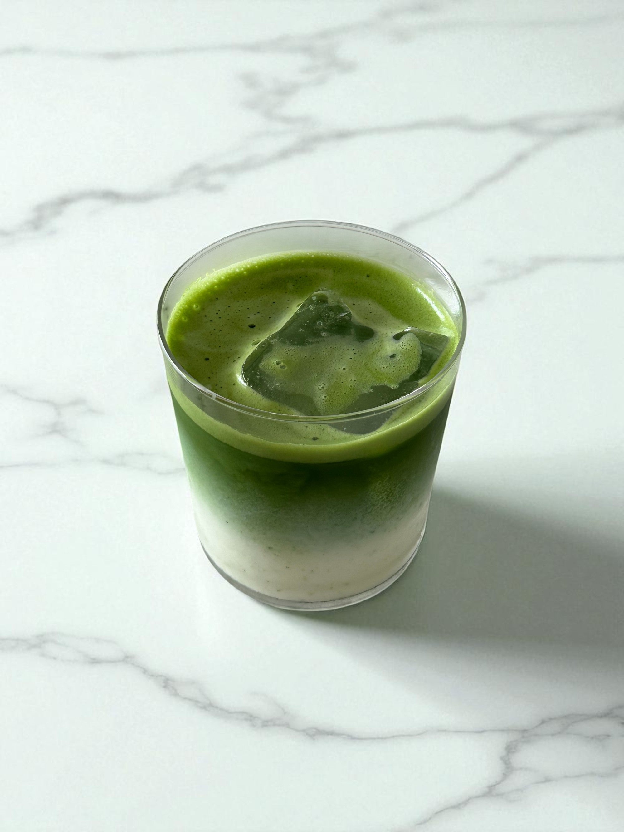 Sift 3g matcha. Add 30ml water at 75 °C, whisk. Pour over 80ml warm milk (or iced with cold milk).