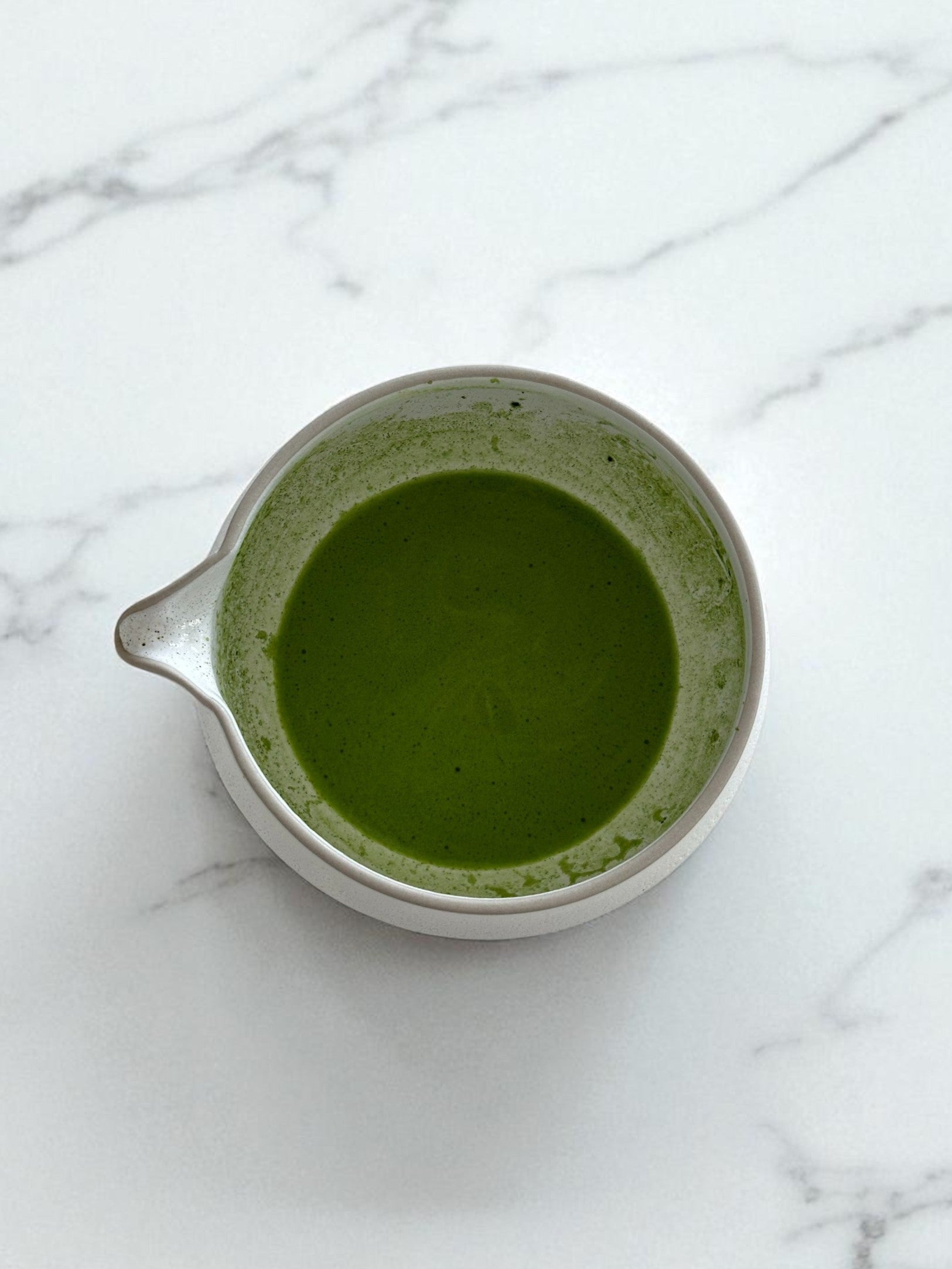Sift 2g matcha. Add 60–70 ml water at 75 °C. Whisk until frothy.