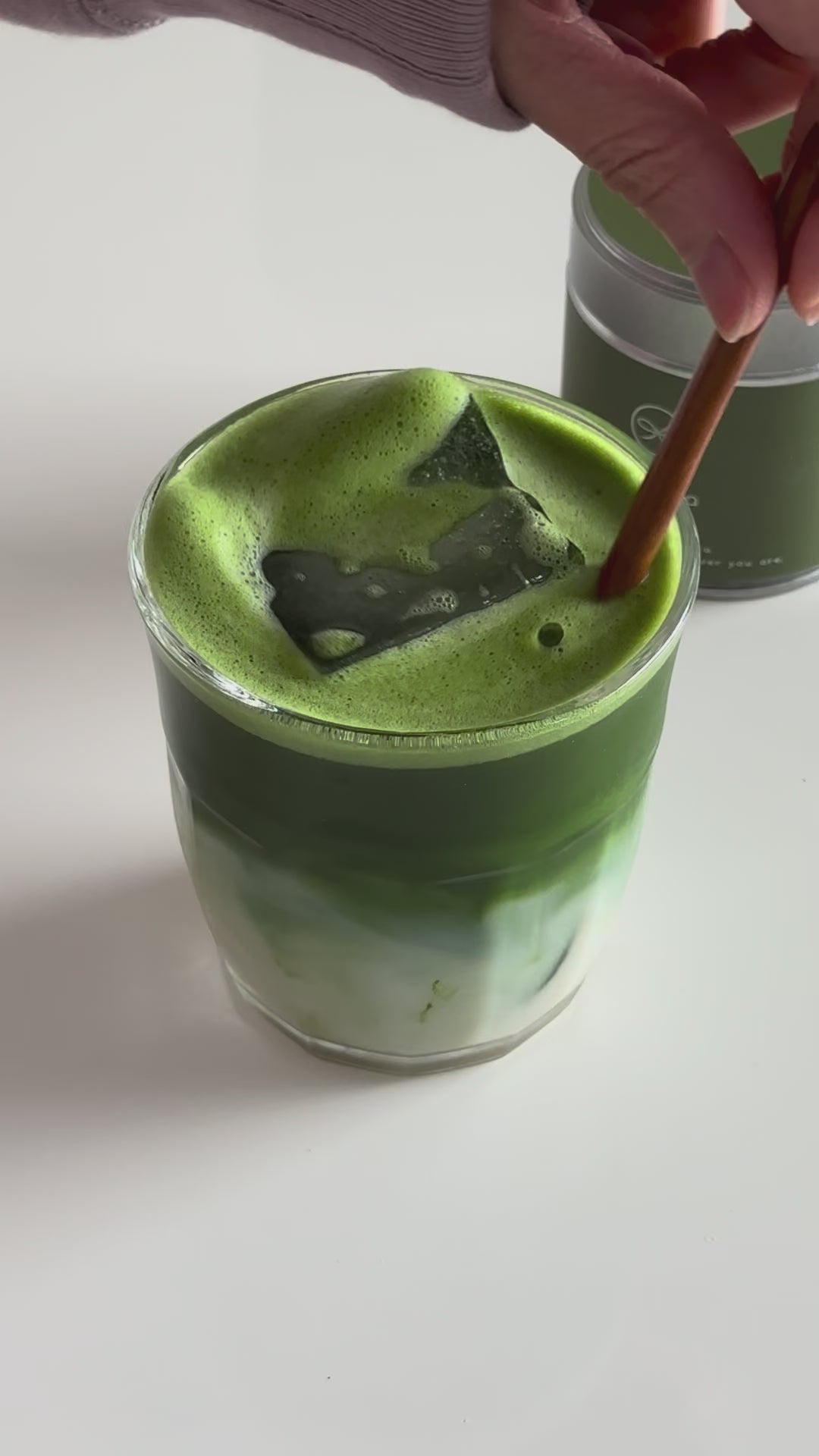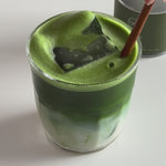Zeef 3 g matcha. Voeg 30 ml water van 75 °C toe en whisk. Schenk over 80 ml warme melk (of ijs met koude melk).