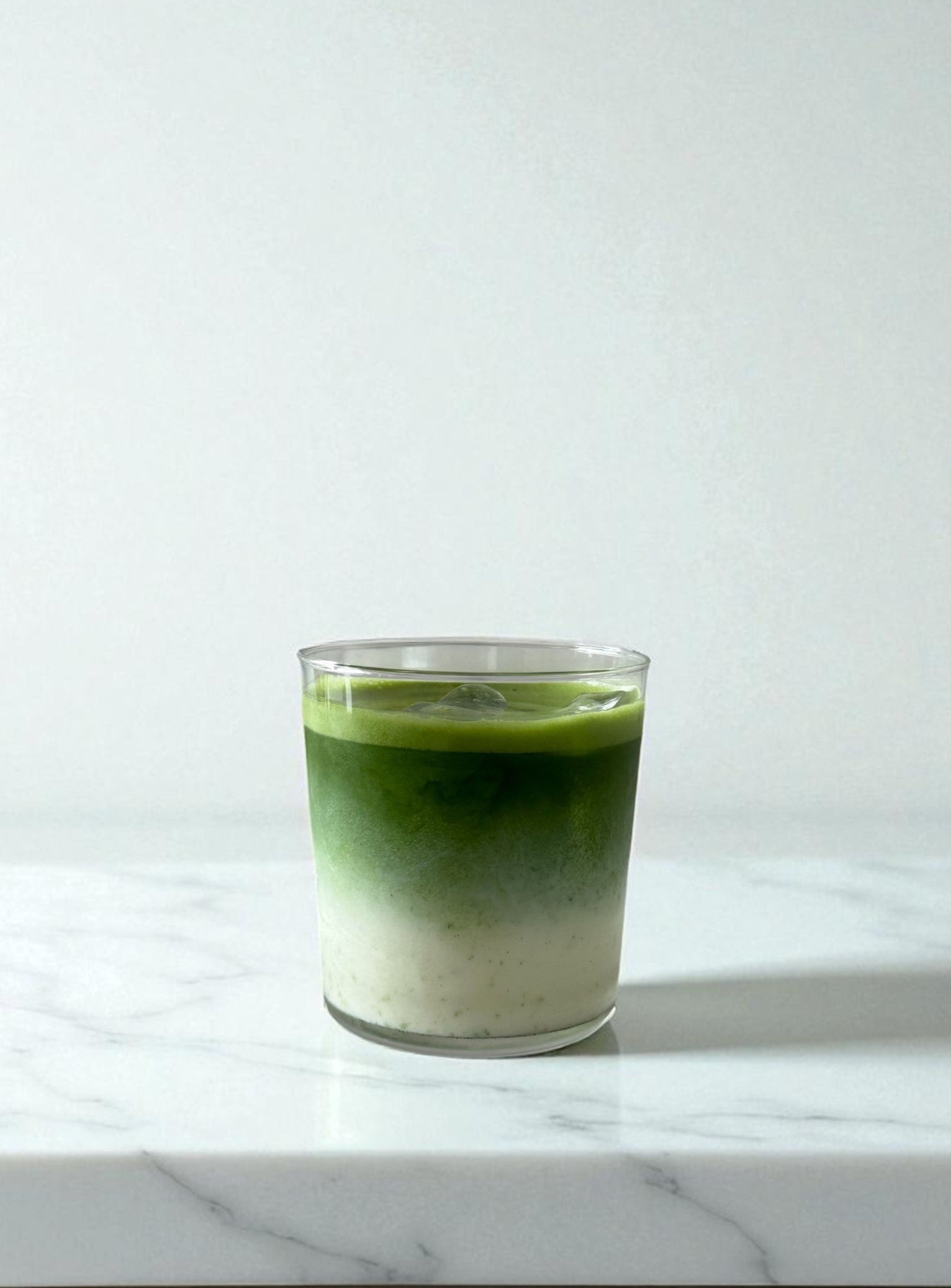 Sift 3g matcha. Add 30ml water at 75 °C, whisk. Pour over 80ml warm milk (or iced with cold milk).