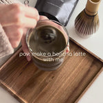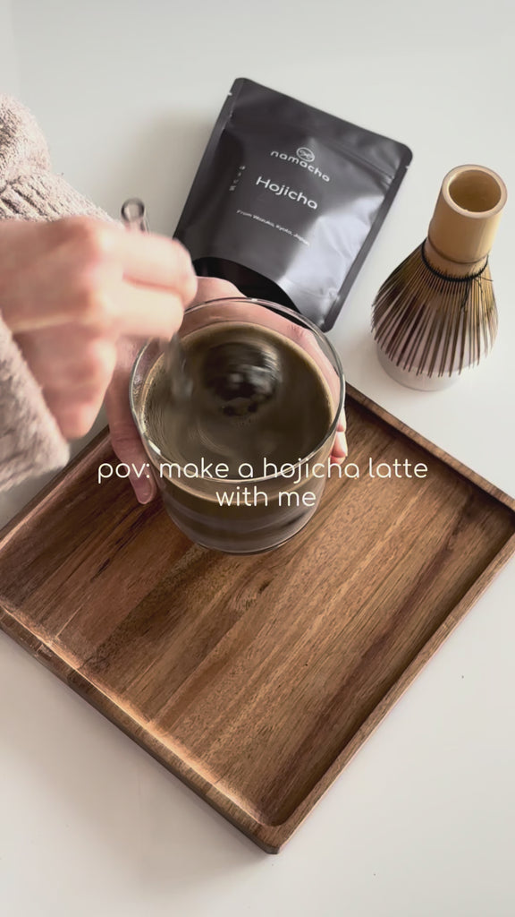 Zeef 3 g hojicha. Voeg 30 ml water van 75 °C toe en whisk. Schenk over 80 ml warme melk (of ijs met koude melk).